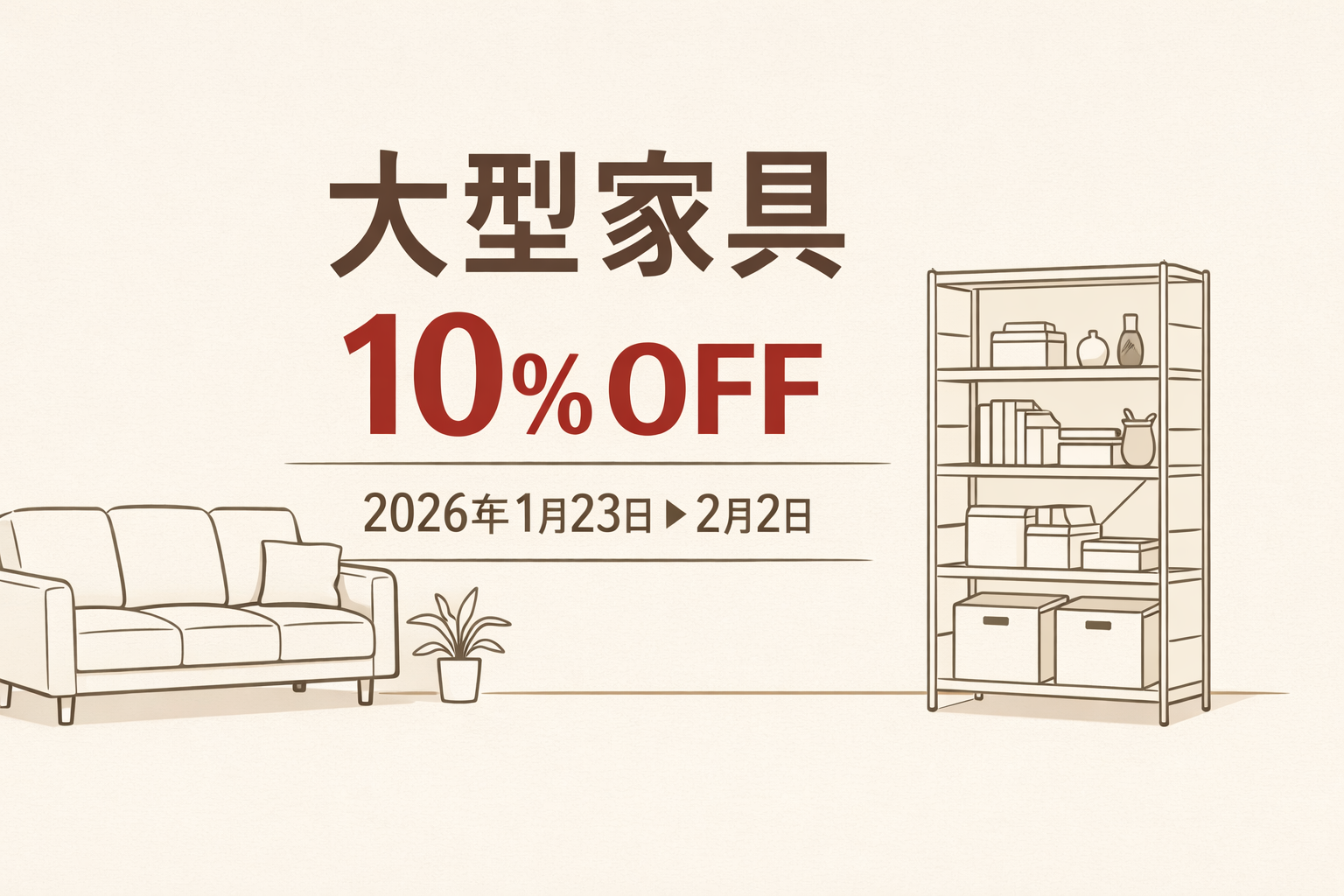 コメント:大型家具は単価が高いぶん、10%が体感で大きいです。たとえば数万円の商品なら数千円単位で変わり、配送や小物の追加費用に回せます。「いつか買う」を「いつ買う」に落とし込むスイッチになりやすいのが、こうした期間の良さです。